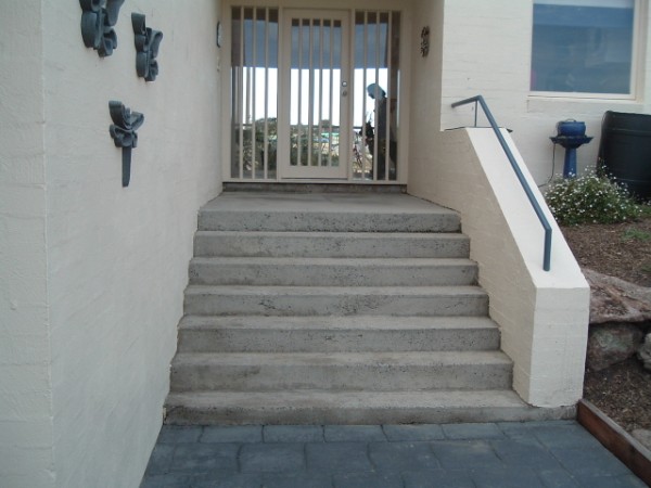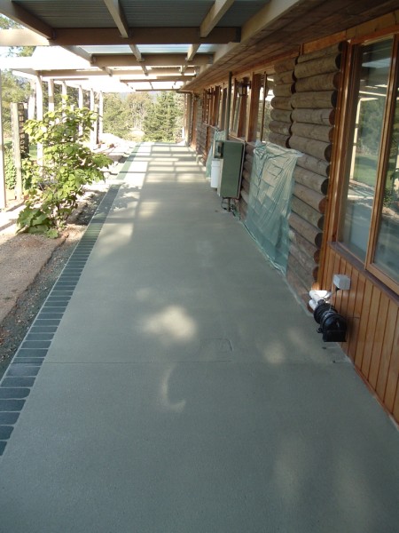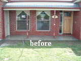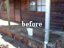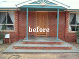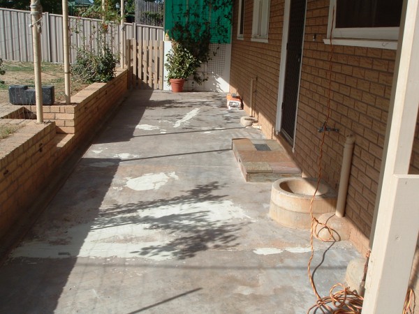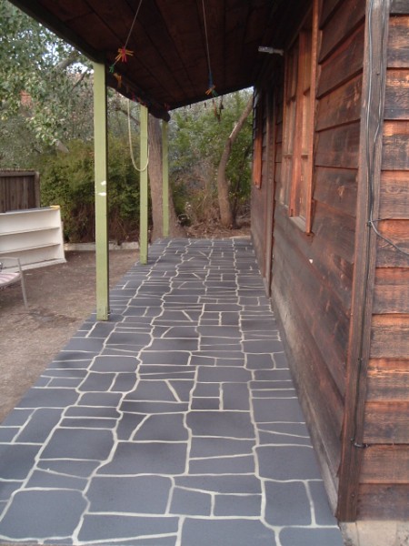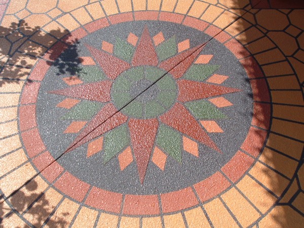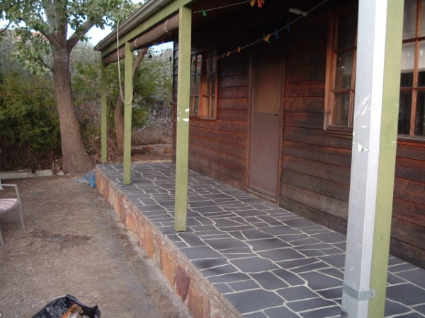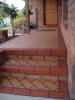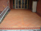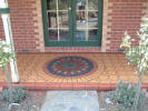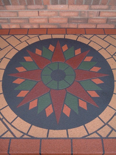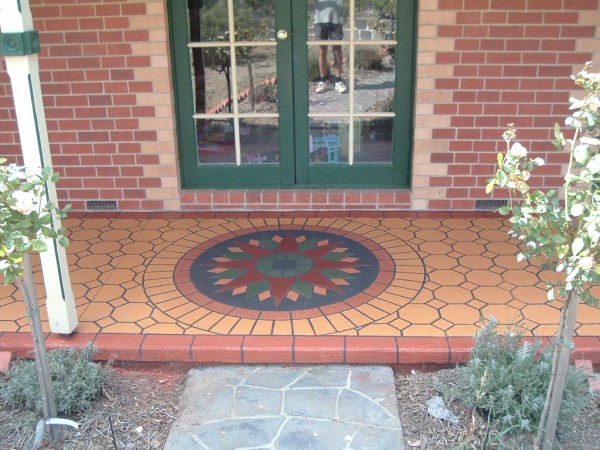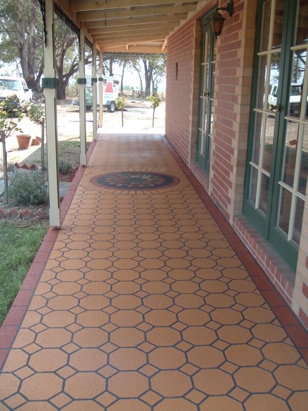 FRONT ENTRANCE: Base colour of Sahara with Charcoal fleck BACK PATIO: Base colour is Sandy Beige with Cobblestone stencil in Dark Terracotta, with Charcoal Fleck Centre Piece is Compass Stencil, Using Heritage Green, Burgundy, Sahara and Light Terracotta.