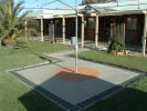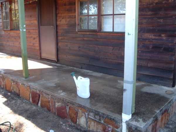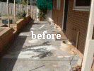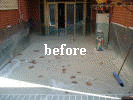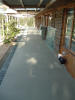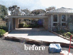 Base coat is sprayed in neutral colour after extensive repairs had been carried out, the main design is a custom taped tile design on a 45° angle in Sahara colour, with a Heritage Green border along the gutter. The slate steps also came up a treat with a High Pressure clean, and a couple of coats of sealer.