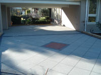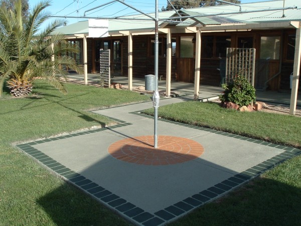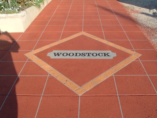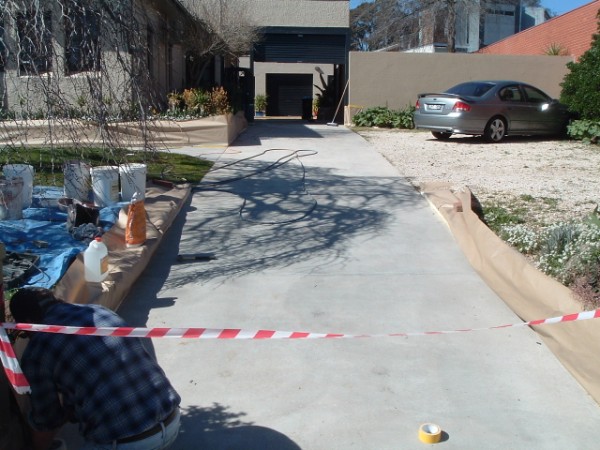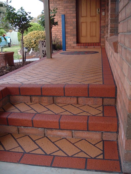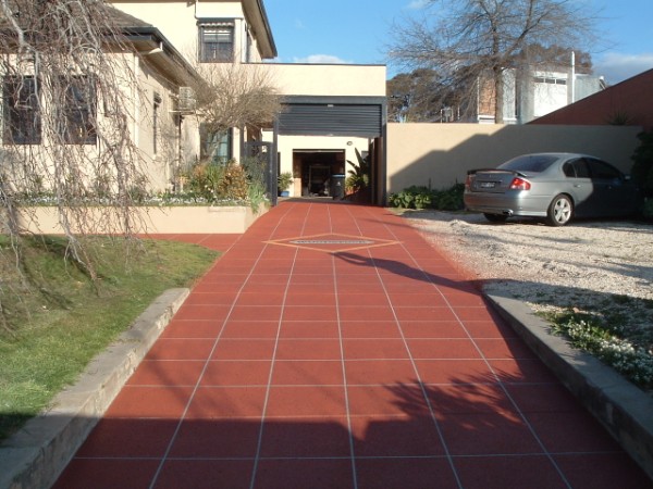 Please Feel free to browse some of our jobsClick on a picture for a larger imageBase colour is Charcoal with Compass stencil in Heritage Green, Burgundy, and Light Terracotta. Main pattern is 45° Herringbone in Sahara, Border is Edge brick Header in Dark Terracotta Base colour is Caramel with Brick pattern in Fawn colour, and Charcoal fleck, Driveway strips are Caramel. Centrepiece is custom taped, and colours are Ghost Gum and Heritage Green.