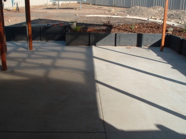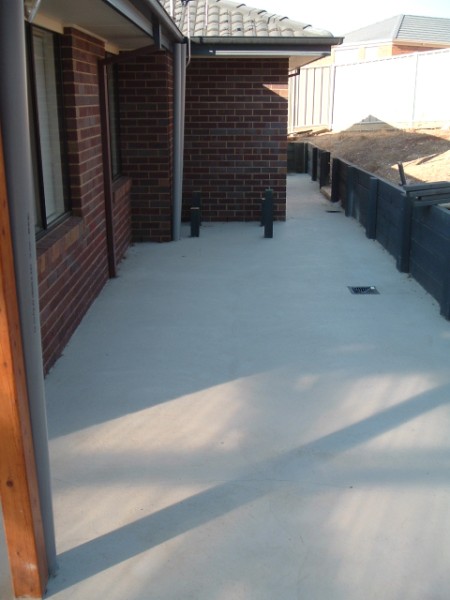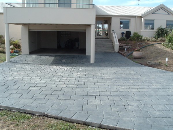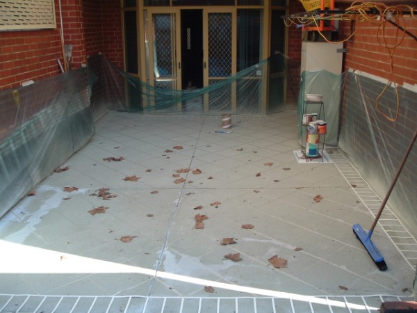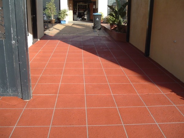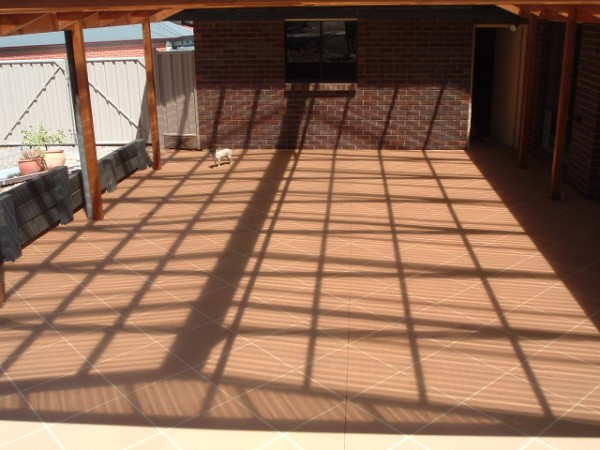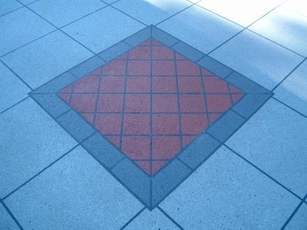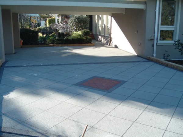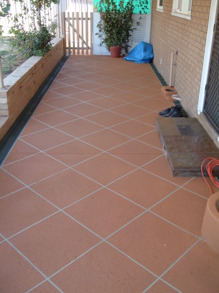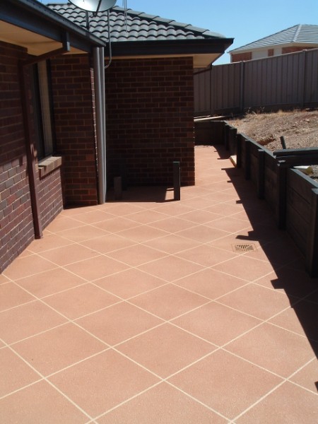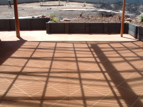 Base colour is Gun Metal. Main design is 500 x 500 custom taped Tiles in French Grey with a Charcoal Fleck. Border is Running Brick Header in Bluestone Colour. There was an expansion joint through the middle of the concrete. so in order to be able to have Diamond layed tiles, it was decided to run a border both sides of the joint to try to hide it. A centrepiece diamond stencil was also used with Dark Terracotta as a contrasting colour.